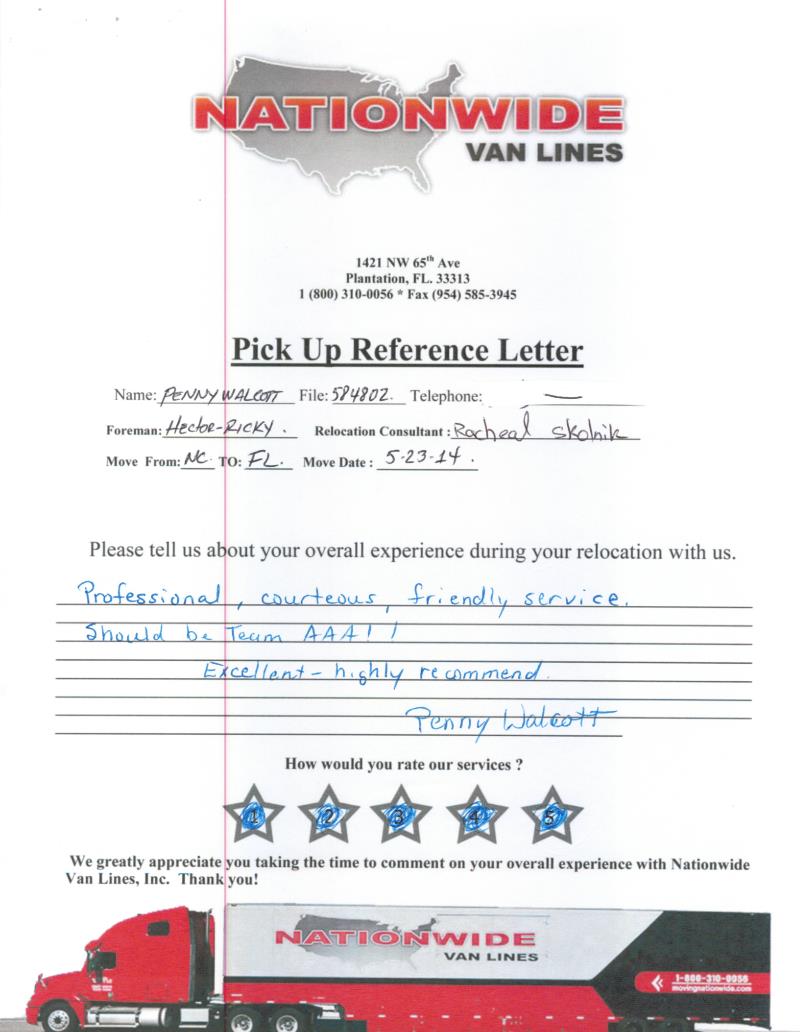 Reputation is hard to build and we appreciate our valued customers in helping us with this task and expressing their moving experience around the web. Nationwide Van Lines performs local moving services in Florida , long distance and international moving services nationwide and worldwide. With our professional and trained staff we provide quality moving experience. We understand how difficult it can be to select the proper moving company for your individual needs and look forward to providing you with the same Quality Moving Service demonstrated within each experience shared amongst the following Moving Company Reviews