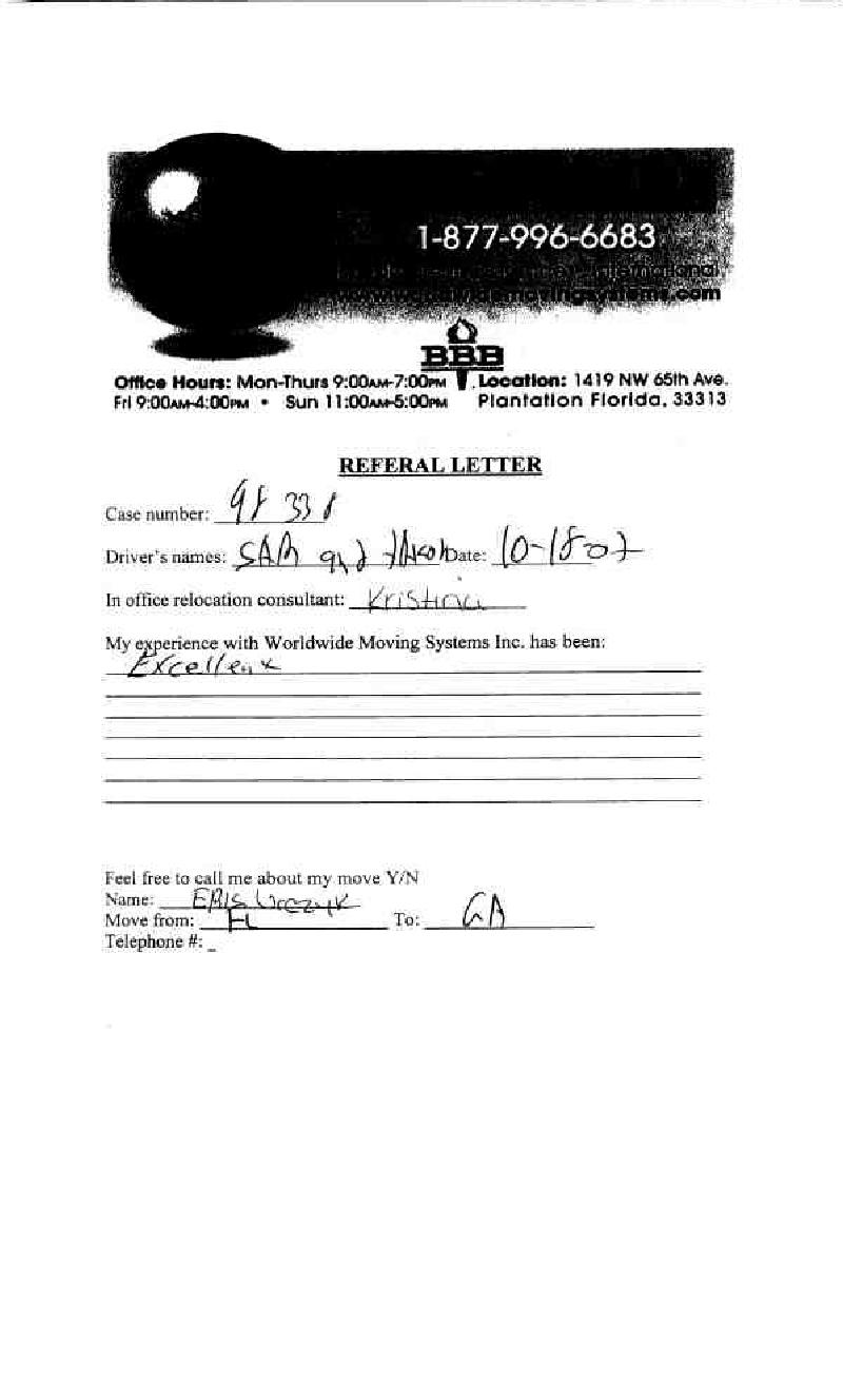 The gentlemen who came to my home for the move were cortious and very professional. They worked very hard and made my moving experience so easy.